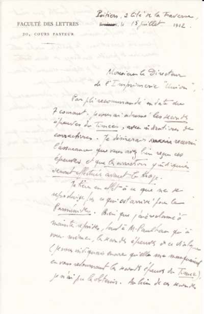 Lettre du 15 juillet 1942. A propos du Tome II de Platon prévu aux Editions de La Pleiade
