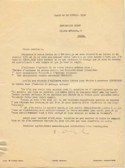 Lettre datée du 26 février 1938 de Ozenfant adressée à l'Imprimerie Union