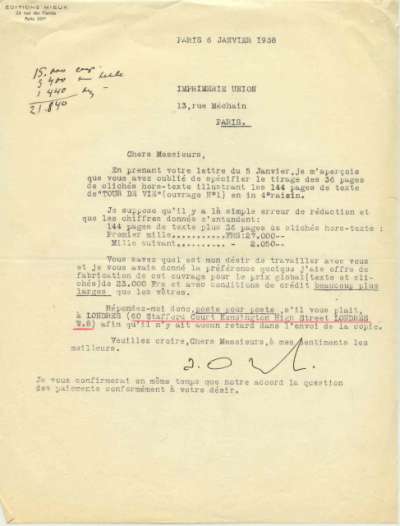 Lettre datée du 16 janvier 1938 de Ozenfant adressée à l'Imprimerie Union