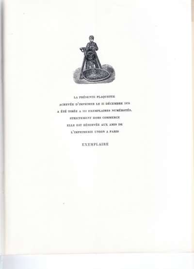 Du bon usage du dépôt de marque : 1890-1903. Texte de Louis Barnier. 21,4x28,2 cm. 50 p. "La présente plaquette achevée d'imprimer le 25 décembre 1970 a été tirée à 333 exemplaires numérotés. Strictement hors commerce elle est réservée aux amis de l'Imprimerie Union à Paris". Vergé blanc. Publication reprise pour le Collège de 'Pataphysique [grande Collection Inquisitive], XCVIII E.P.